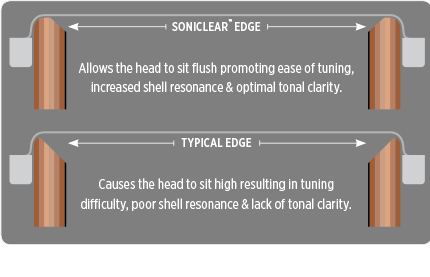 典型的なベアリングエッジは「シェル外側から45度に鋭角にカットする事が良い」と言う事が定説のようでしたが、我々はヘッドとの相性とサウンドの向上、チューニングの向上性等、幅広い観点によりソニックリアー・ベアリングエッジを全てのアーモリーシリーズに採用させて頂きました。